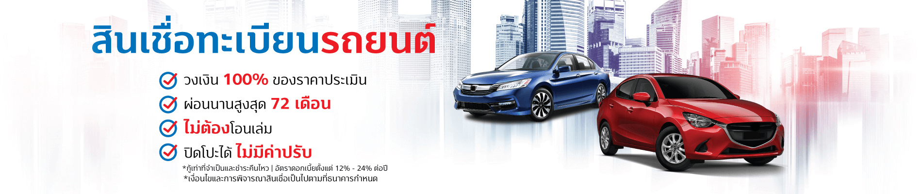 หมายเหตุ : ธนาคารขอสงวนสิทธิ์ในการกำหนดวงเงิน อัตราดอกเบี้ย ระยะเวลาผ่อนชำระ และผู้ค้ำประกัน โดยพิจารณาจากยี่ห้อ รุ่น ปีที่จดทะเบียนของรถ รวมถึงรายได้และสถานภาพต่างๆ ของผู้สมัคร ภายใต้หลักเกณฑ์การพิจารณาสินเชื่อของทางธนาคาร